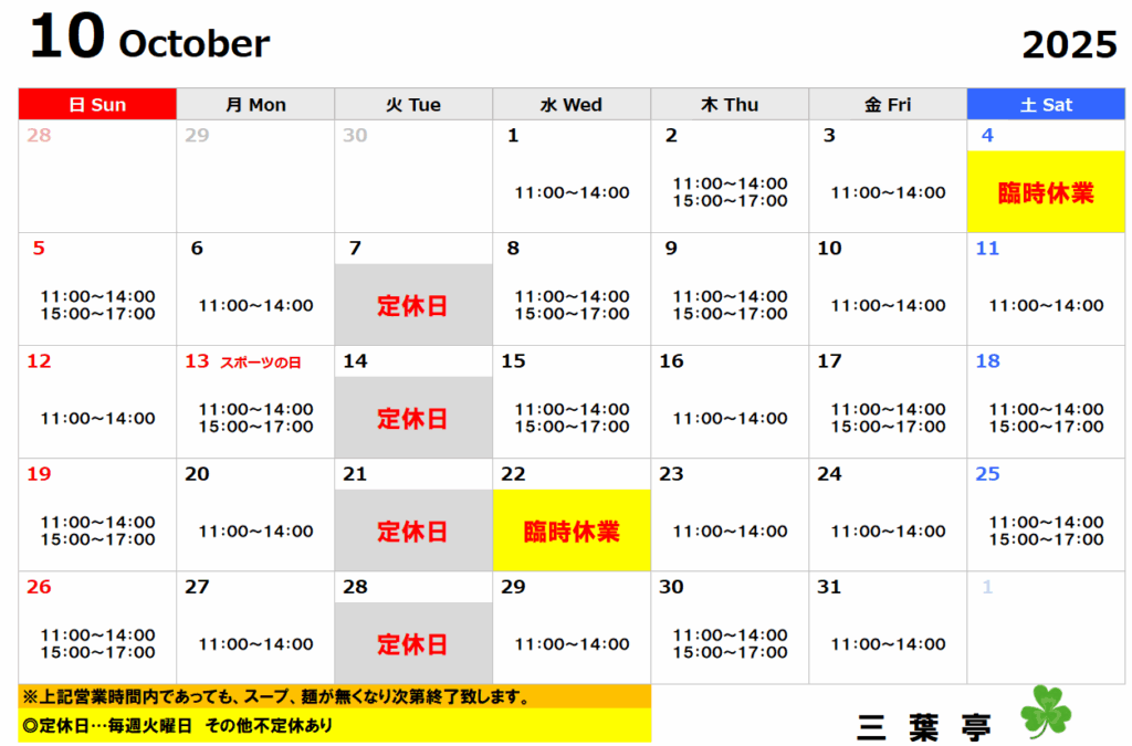 平田ショッピングセンターViva内、三葉亭10月の営業日のご案内です