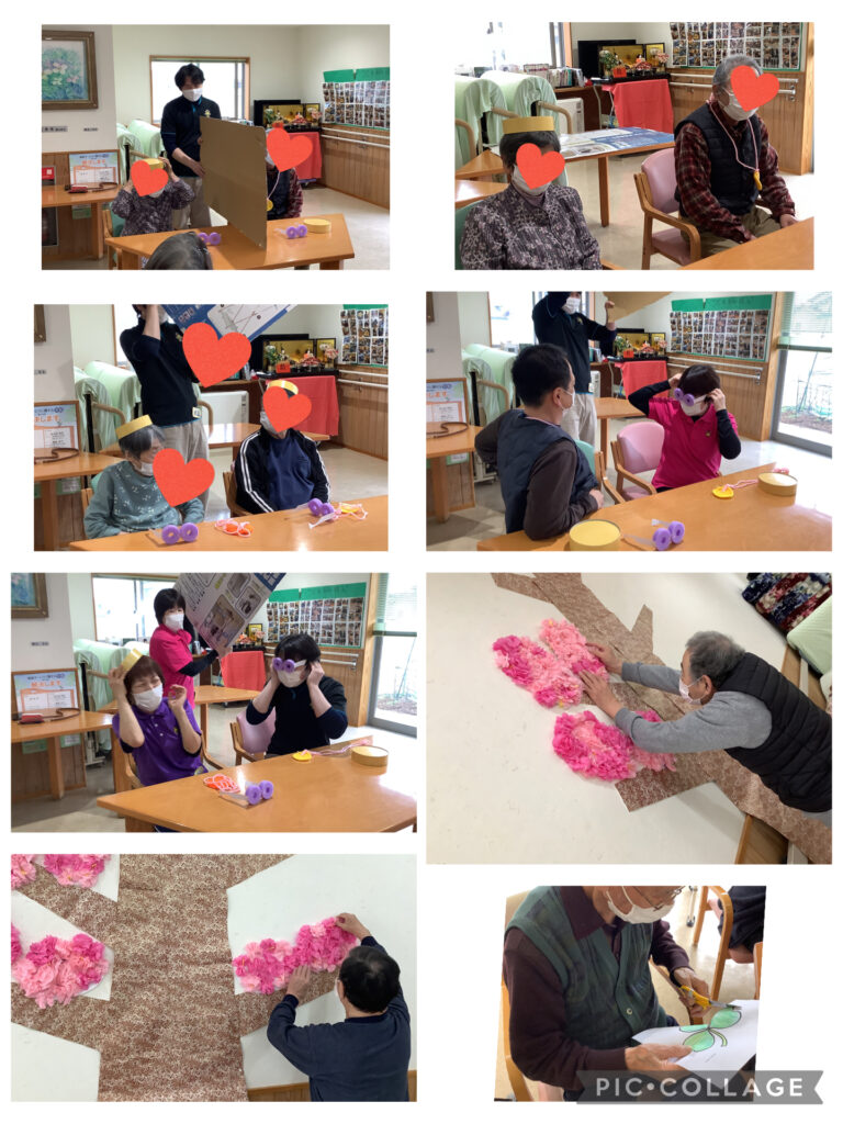 レクリエーションでは、相思相愛ゲームで盛り上がり、相手の気持ちを考えて同じアイテムになるかドキドキゲームでした。初めてトライしたゲームで、利用者さまも悩みながらのゲームでした。職員も混ざってやってみましたよ。壁画では🌸大きな桜の木が登場して、花紙で作った🌸を皆さんと頑張って作ってます。満開が待ち遠しいです。