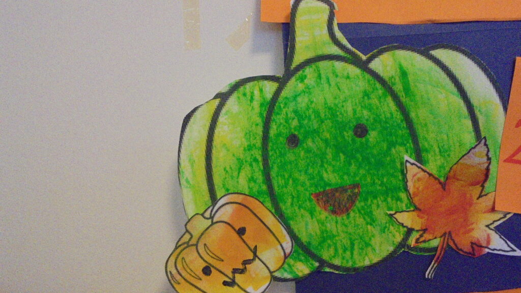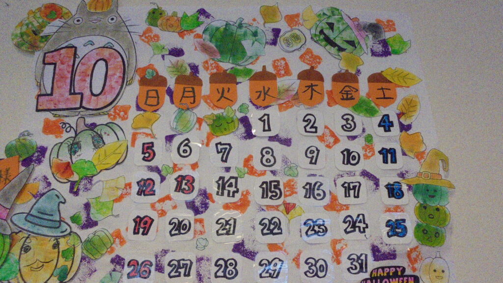 まだまだ暑い日が続きますが、もう10月になりました。季節は秋です。プレーゲでは毎月その季節にあったカレンダーを作って掲示しています。その月の誕生日の方の名前も一緒に紹介しています。今回も10月分のカレンダーを利用者さんとスタッフで作成しました。ハロウィンにちなんでかわいいかぼちゃに目を書いたり、好きな色を塗ってもらったり工夫をした作品です。